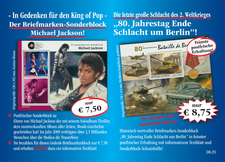Warenkorb Sie haben bisher keine Artikel in Ihrem Warenkorb. Der postfrische Briefmarken-Sonderblock „King of Pop – Michael Jackson“! Sichern Sie sich noch heute den postfrischen Briefmarken-Sonderblock „King of Pop – Michael Jackson“ inkl. informativem Textblatt und Sonderblock-Schutzhülle zum Sonderpreis von nur € 7,50 und monatlich weitere Ausgaben aus dieser Sammlung unverbindlich und ohne Kaufverpflichtung zur Ansicht. Sie haben bei jeder Lieferung ein 14-tägiges Rückgaberecht! 7,50 € inkl. gesetzlicher MwSt. Menge: zzgl. anteilige Versandkosten (Porto, Verpackung, Versicherung) Dieses Produkt kann nur 5 Mal pro Kunde bestellt werden. Bei Fragen wenden Sie sich bitte an unseren Kundenservice. Der postfrische Briefmarken-Sonderblock „80. Jahrestag Ende Schlacht um Berlin“! Sichern Sie sich noch heute den postfrischen und historisch wertvollen Briefmarken-Sonderblock „80. Jahrestag Ende Schlacht um Berlin“ inkl. informativem Textblatt und Sonderblock-Schutzhülle zum Sonderpreis von nur € 8,75 und monatlich weitere Ausgaben aus dieser Sammlung unverbindlich und ohne Kaufverpflichtung zur Ansicht. Sie haben bei jeder Lieferung ein 14-tägiges Rückgaberecht! 8,75 € inkl. gesetzlicher MwSt. Menge: zzgl. anteilige Versandkosten (Porto, Verpackung, Versicherung) Dieses Produkt kann nur 5 Mal pro Kunde bestellt werden. Bei Fragen wenden Sie sich bitte an unseren Kundenservice. Ist das auch interessant für Sie?