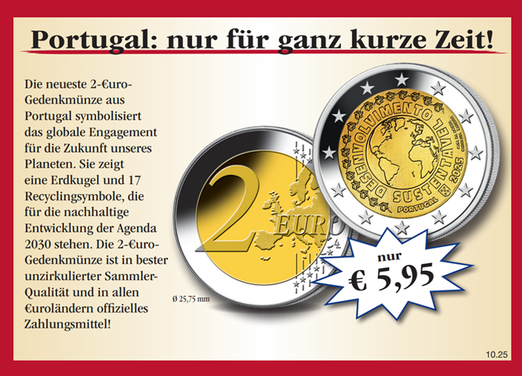 Warenkorb Sie haben bisher keine Artikel in Ihrem Warenkorb. Die 2-Euro-Gedenkmünze „Nachhaltige Entwicklung“ aus Portugal von 2025! Sichern Sie sich noch heute die 2-Euro-Gedenkmünze „Nachhaltige Entwicklung“ aus Portugal von 2025 in bankfrischer Sammler-Qualität zum Sonderpreis von nur € 5,95 und monatlich weitere Ausgaben aus dieser Sammlung unverbindlich und ohne Kaufverpflichtung zur Ansicht. Sie haben bei jeder Lieferung ein 14-tägiges Rückgaberecht! 5,95 € inkl. gesetzlicher MwSt. Menge: zzgl. anteilige Versandkosten (Porto, Verpackung, Versicherung) Dieses Produkt kann nur 5 Mal pro Kunde bestellt werden. Bei Fragen wenden Sie sich bitte an unseren Kundenservice. Ist das auch interessant für Sie?