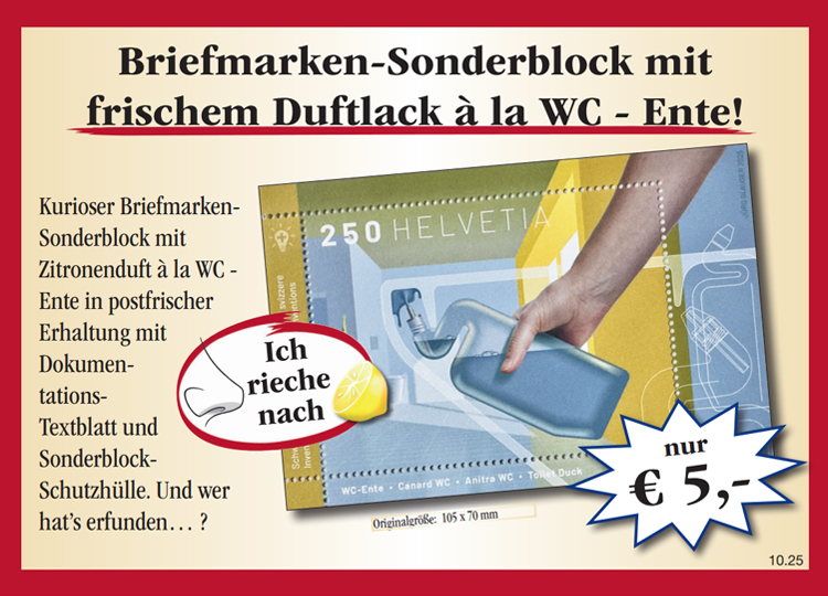 Warenkorb Sie haben bisher keine Artikel in Ihrem Warenkorb. Der postfrische Briefmarken-Sonderblock mit frischem Duftlack á la WC - Ente aus der Schweiz! Sichern Sie sich noch heute den postfrischen Briefmarken-Sonderblock mit frischem Duftlack á la WC - Ente aus der Schweiz zum Sonderpreis von nur € 5,- und monatlich weitere Ausgaben aus dieser Sammlung unverbindlich und ohne Kaufverpflichtung zur Ansicht. Sie haben bei jeder Lieferung ein 14-tägiges Rückgaberecht! 5,00 € inkl. gesetzlicher MwSt. Menge: zzgl. anteilige Versandkosten (Porto, Verpackung, Versicherung) Dieses Produkt kann nur 5 Mal pro Kunde bestellt werden. Bei Fragen wenden Sie sich bitte an unseren Kundenservice. Ist das auch interessant für Sie?