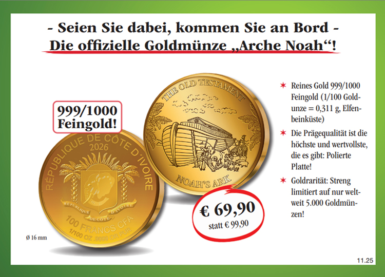 Warenkorb Sie haben bisher keine Artikel in Ihrem Warenkorb. Die offizielle Goldmünze „Arche Noah“! Sichern Sie sich noch heute die offizielle Goldmünze „Arche Noah“ (999/1000 Feingold, Polierte Platte, 16 mm, 0,311 g, Elfenbeinküste) zum Sonderpreis von nur € 69,90 statt € 99,90 und monatlich eine weitere Ausgabe aus dieser Sammlung unverbindlich und ohne Kaufverpflichtung zur Ansicht. Sie haben bei jeder Lieferung ein 14-tägiges Rückgaberecht! statt 99,90 € 69,90 € inkl. gesetzlicher MwSt. Menge: zzgl. anteilige Versandkosten (Porto, Verpackung, Versicherung) Dieses Produkt kann nur 5 Mal pro Kunde bestellt werden. Bei Fragen wenden Sie sich bitte an unseren Kundenservice. Ist das auch interessant für Sie?
