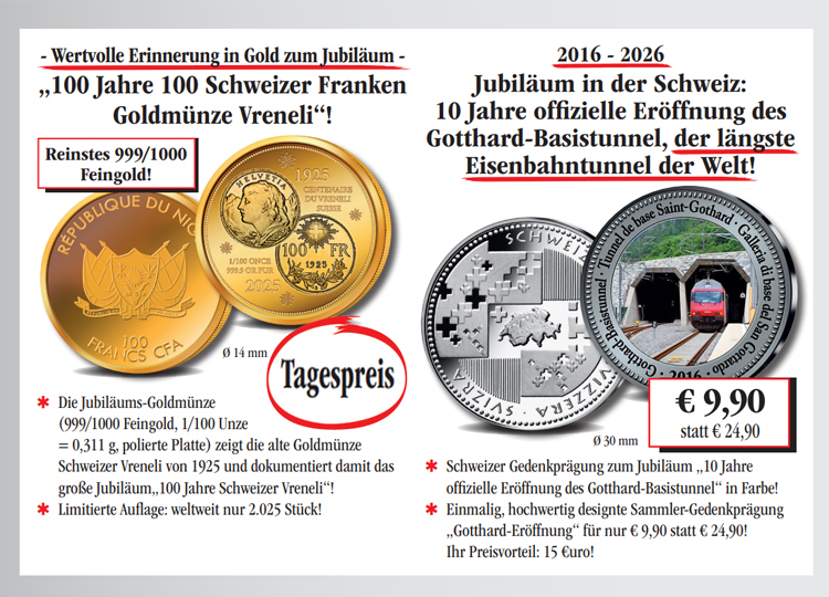 Warenkorb Sie haben bisher keine Artikel in Ihrem Warenkorb. Die offizielle Goldmünze „100 Jahre 100 Schweizer Franken Goldmünze Vreneli“! Sichern Sie sich noch heute die offizielle Goldmünze „100 Jahre 100 Schweizer Franken Goldmünze Vreneli“ (999/1000 Feingold, Polierte Platte, 14 mm, 0,311 g, Niger) zum Tagespreis von nur € 79,90 statt € 119,- und monatlich eine weitere Ausgabe aus dieser Sammlung unverbindlich und ohne Kaufverpflichtung zur Ansicht. Sie haben bei jeder Lieferung ein 14-tägiges Rückgaberecht! statt 119,00 € 79,90 € inkl. gesetzlicher MwSt. Menge: zzgl. anteilige Versandkosten (Porto, Verpackung, Versicherung) Dieses Produkt kann nur 5 Mal pro Kunde bestellt werden. Bei Fragen wenden Sie sich bitte an unseren Kundenservice. Die Schweizer Gedenkprägung „10 Jahre offizielle Eröffnung des Gotthard-Basistunnel“! Sichern Sie sich noch heute die Schweizer Gedenkprägung mit Kaltemaille-Farbauflage „10 Jahre offizielle Eröffnung des Gotthard-Basistunnel“ zum Sonderpreis von nur € 9,90 statt € 24,90 und monatlich eine weitere Ausgabe aus dieser Sammlung unverbindlich und ohne Kaufverpflichtung zur Ansicht. Sie haben bei jeder Lieferung ein 14-tägiges Rückgaberecht! statt 24,90 € 9,90 € inkl. gesetzlicher MwSt. Menge: zzgl. anteilige Versandkosten (Porto, Verpackung, Versicherung) Dieses Produkt kann nur 5 Mal pro Kunde bestellt werden. Bei Fragen wenden Sie sich bitte an unseren Kundenservice. Ist das auch interessant für Sie?