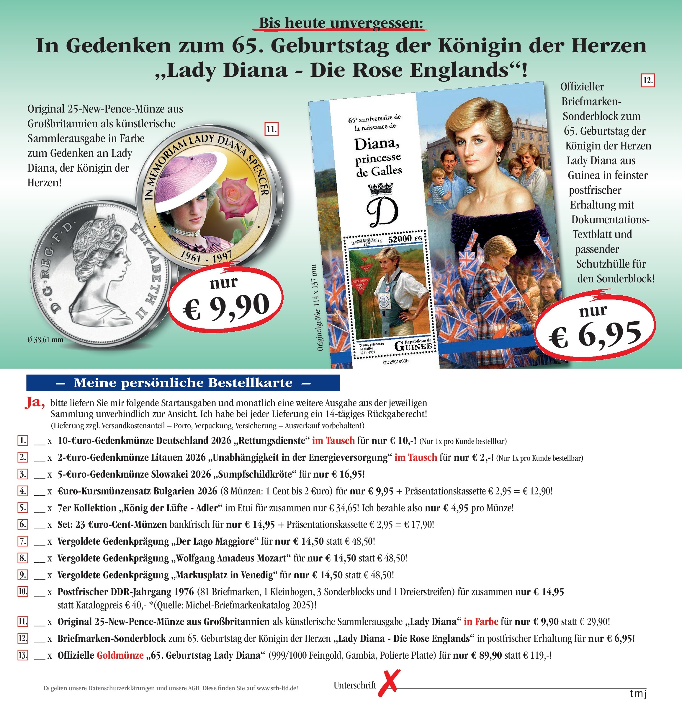 Vertrauens-Garantie/Widerrufsrecht: Ohne Angaben von Gründen können Sie Ihren Auftrag innerhalb von 14 Tagen widerrufen. Eine kurze Nachricht oder Rücksendung der Ware an SRH genügt. Sie tragen die unmittelbaren Kosten für die Rücksendung an Sir Rowland Hill Ltd. GmbH & Co. KG, Buchhorstblick 7a, 38162 Weddel. Es gelten unsere AGB, die Sie unter www.srh-ltd.de einsehen oder schriftlich bei uns anfordern können. Datenschutz-Hinweis: Die Verwendung Ihrer personenbezogenen Daten für Werbung erfolgt vertraulich und nur von SRH. Der Widerruf ist jederzeit möglich: Per Post an SRH oder E-Mail an datenschutz@srh-ltd.de