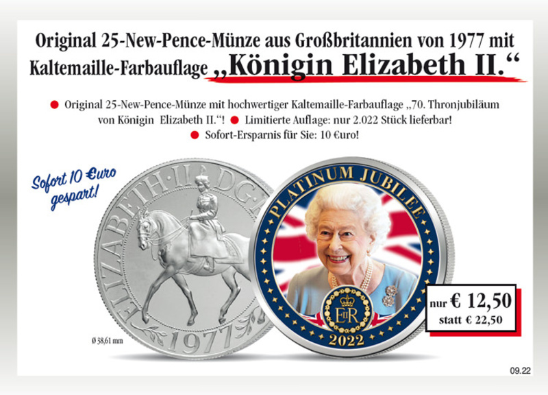 Die original 25-New-Pence-Münze von 1977 mit Kaltemaille-Farbauflage "Königin Elizabeth II."!